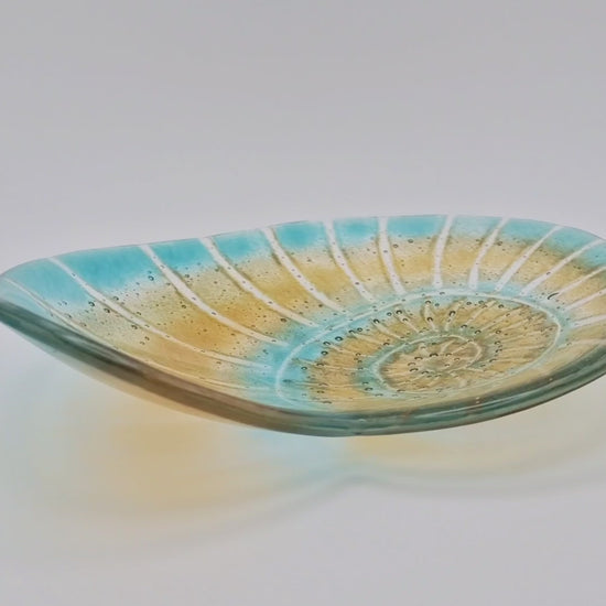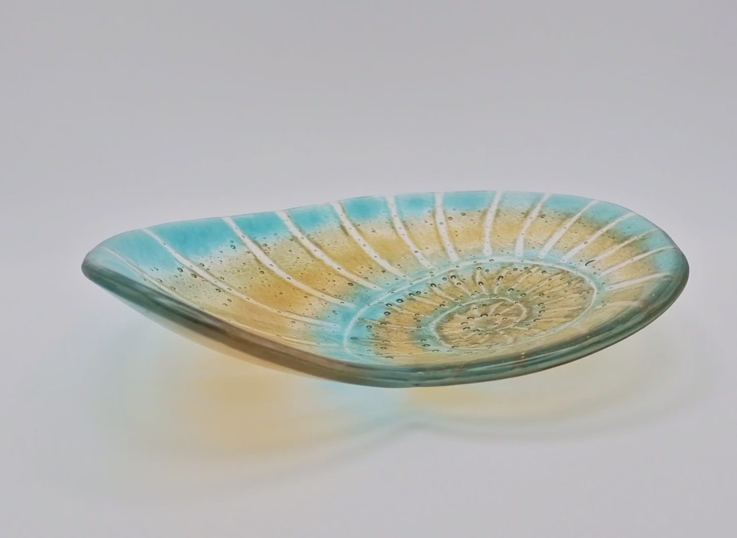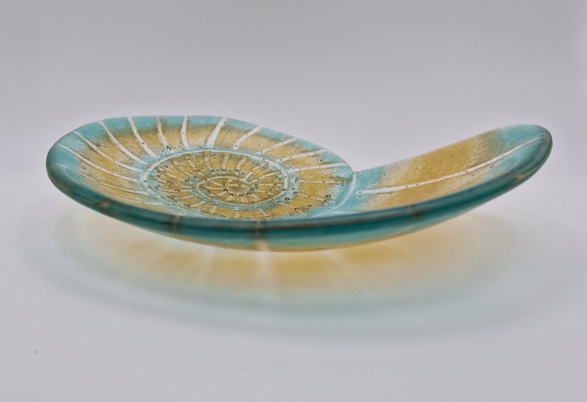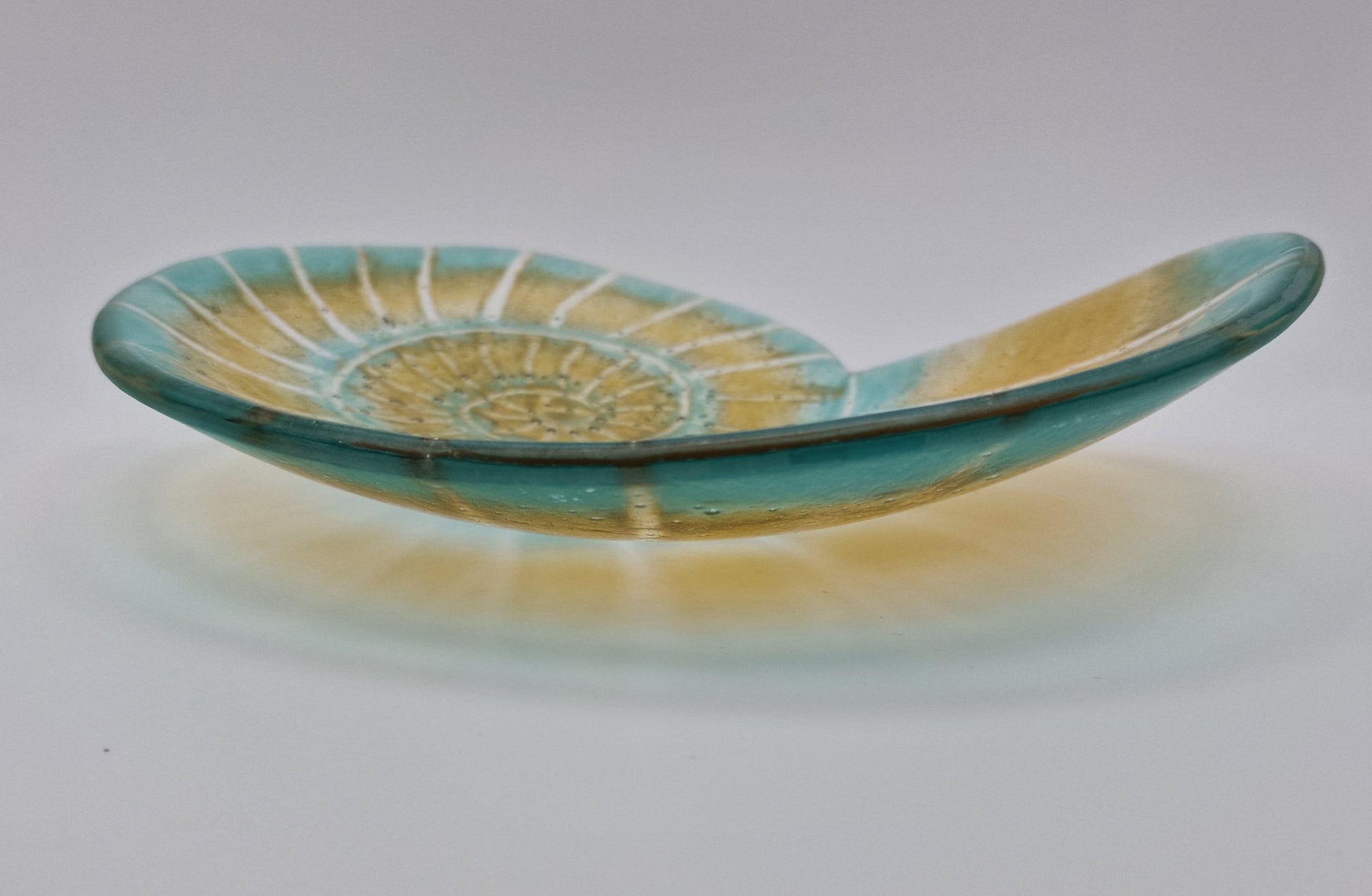 Fused glass ammonite decorative dish in blue and amber tones, unusual and eye catching shape, with a wonderful play of light and colour cast below on a white surface.