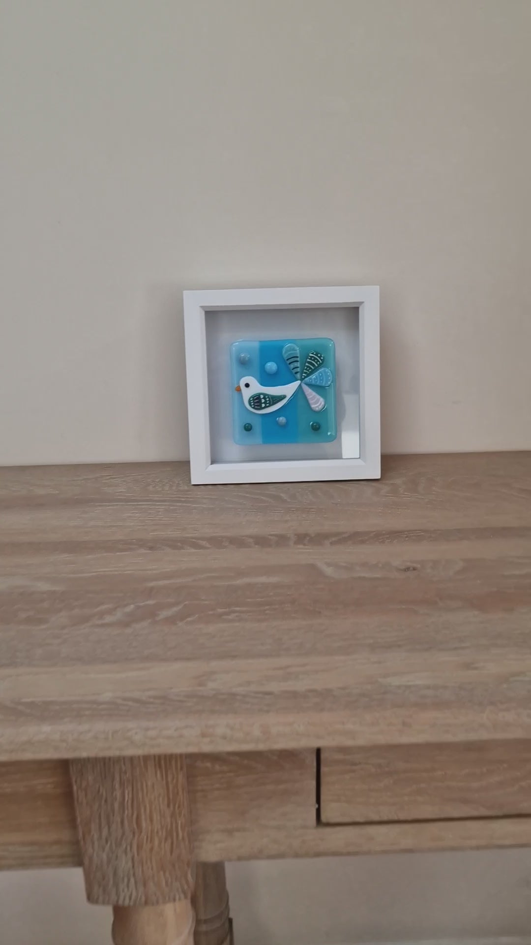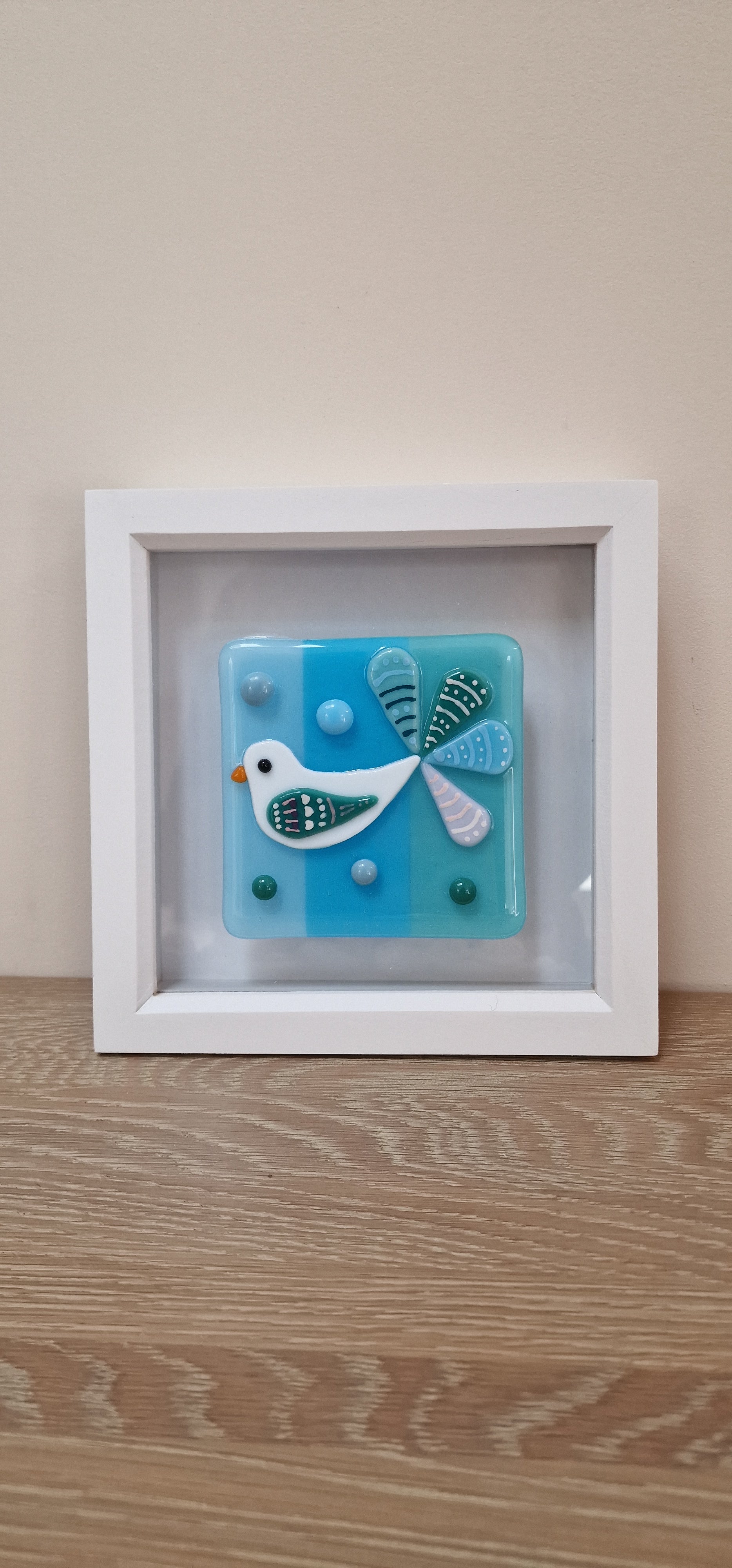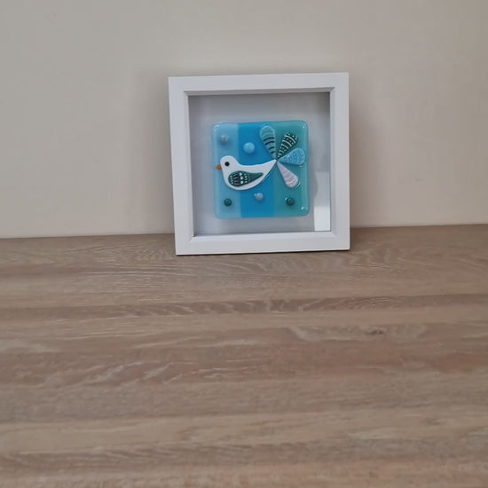 Handmade beautiful joyful fused glass bird in box frame