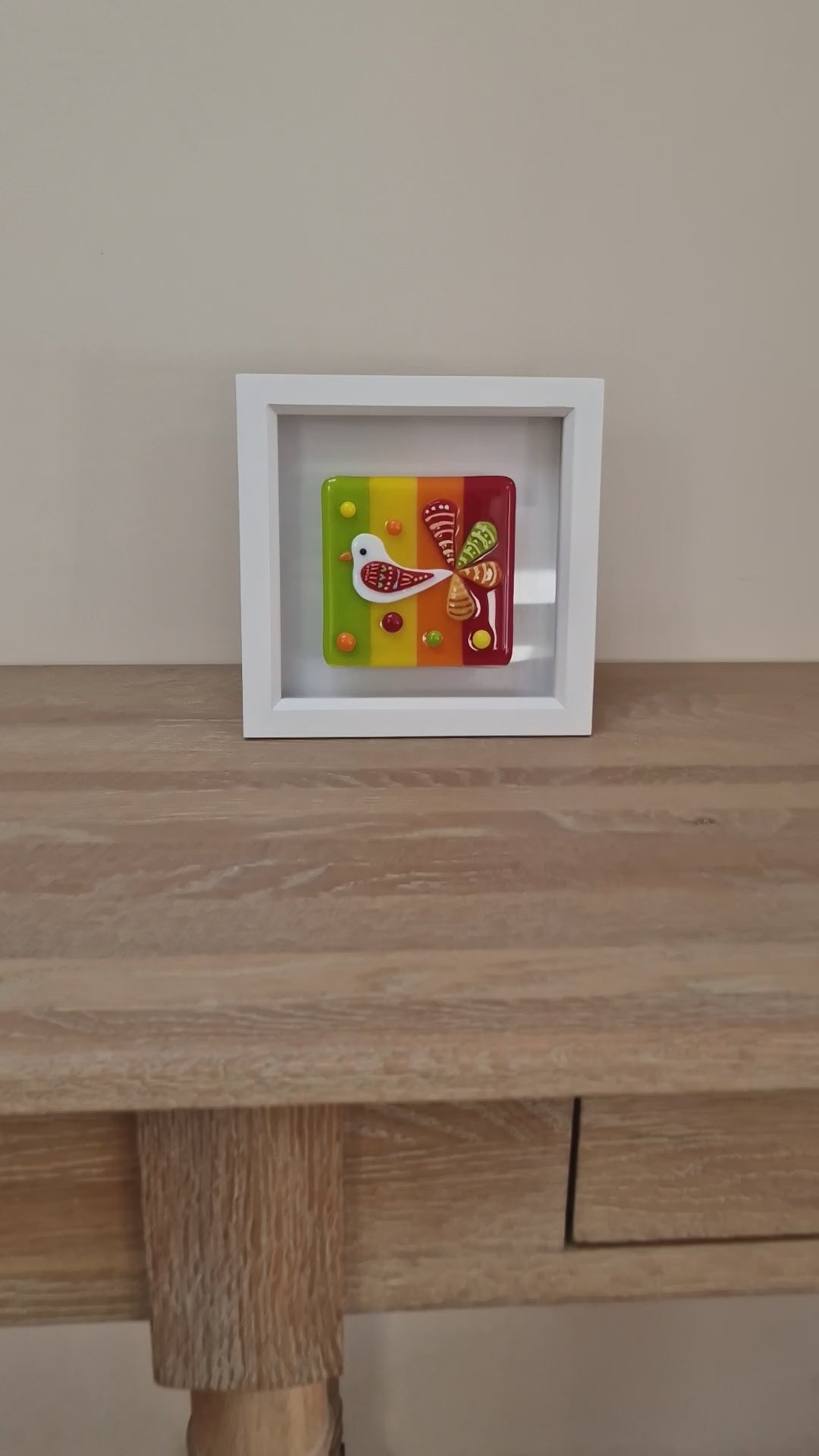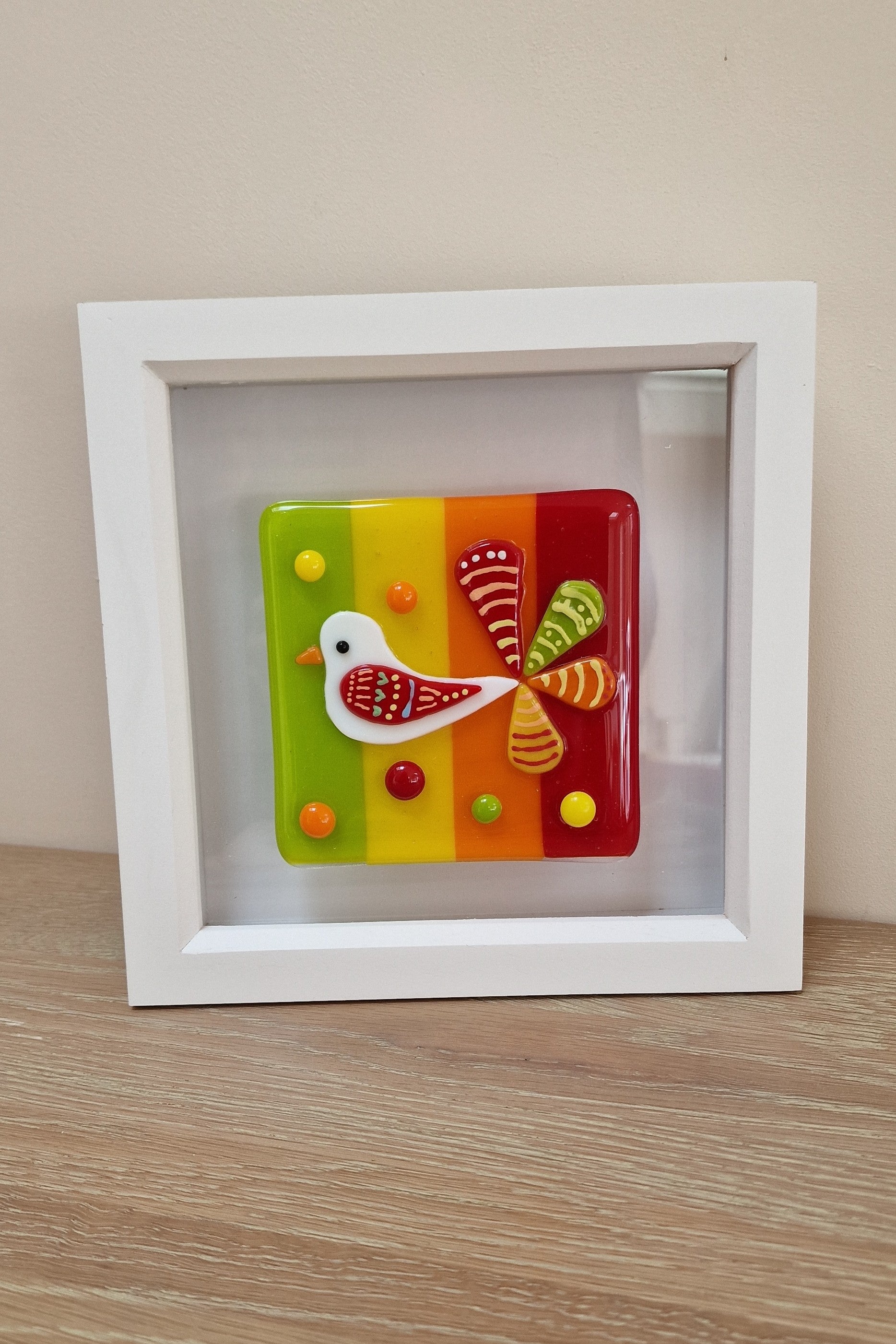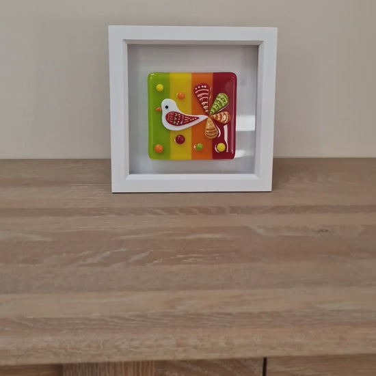 Handmade beautiful joyful fused glass bird in box frame