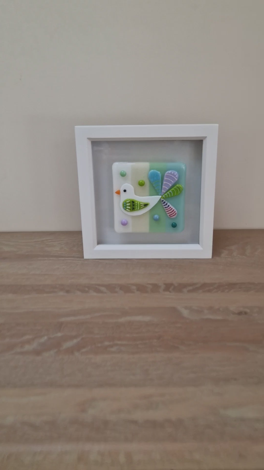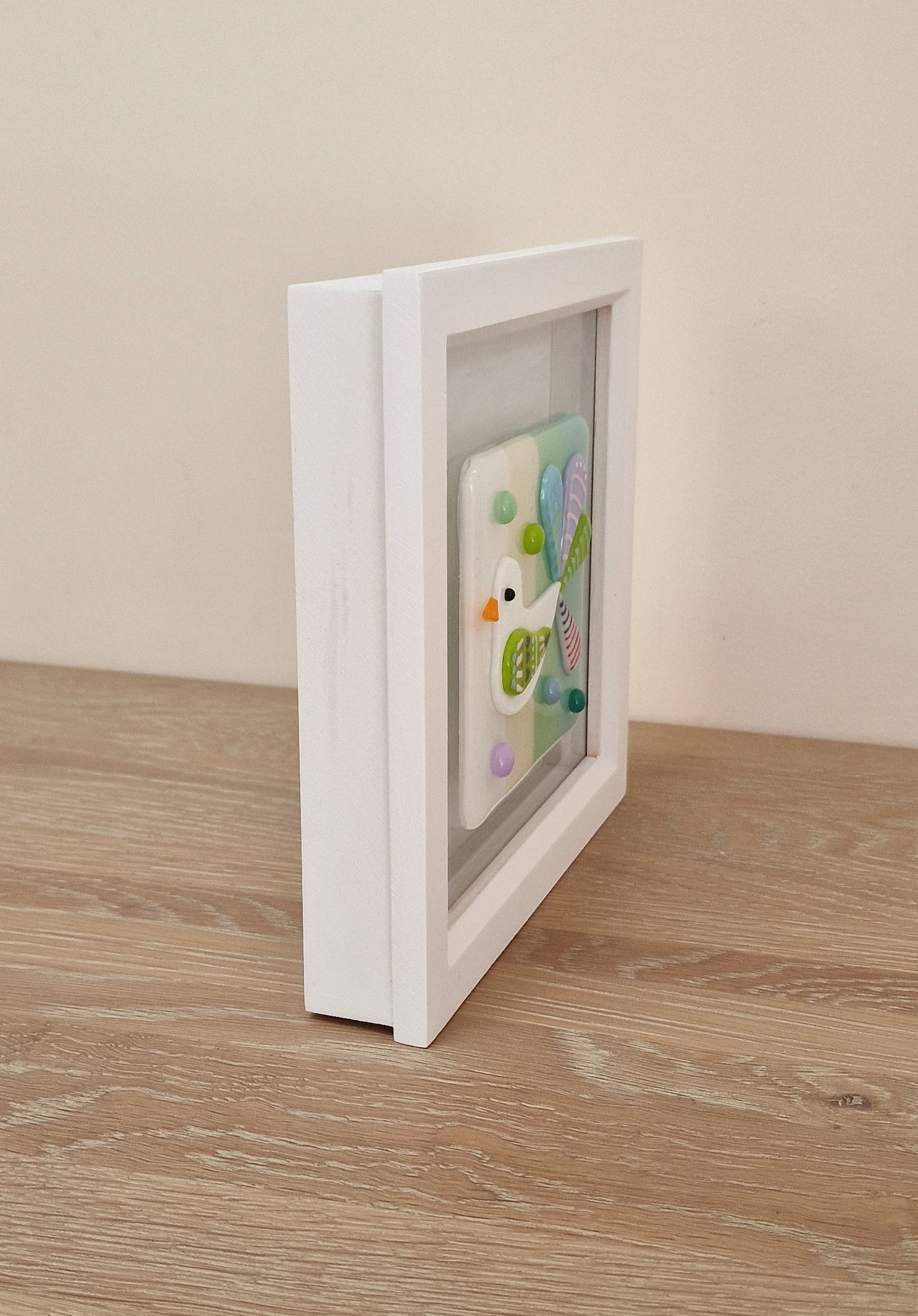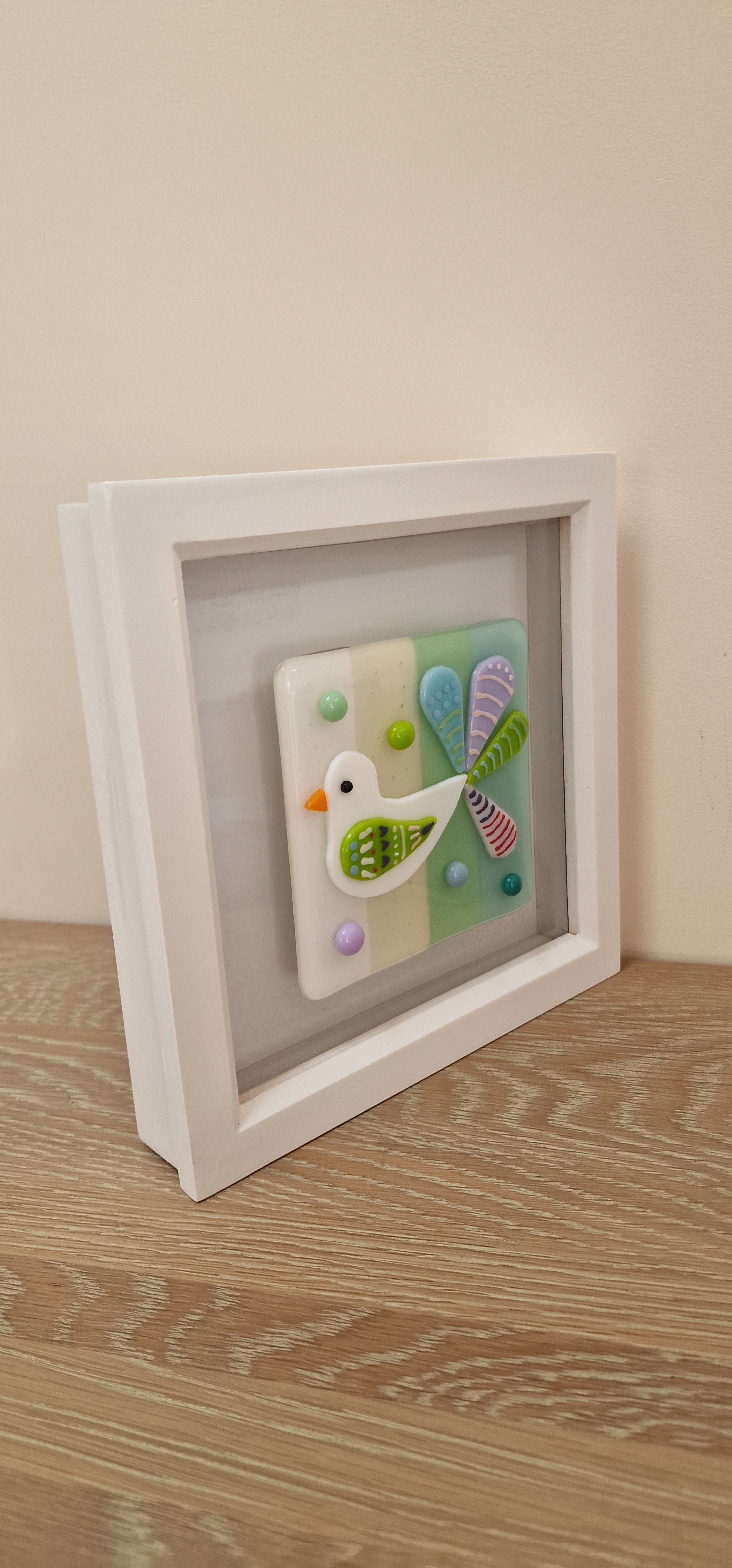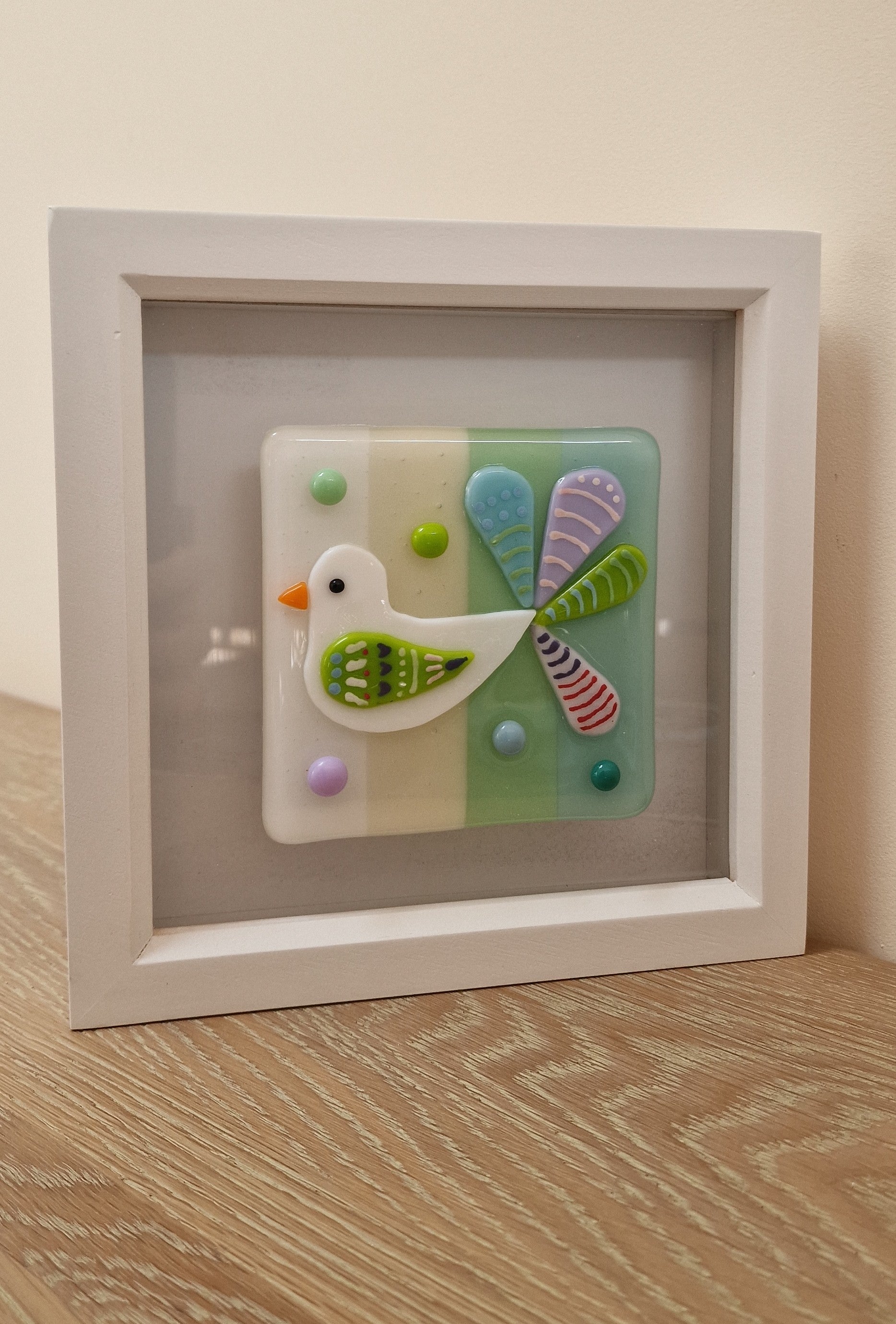Handmade beautiful joyful fused glass bird in box frame