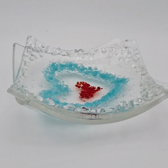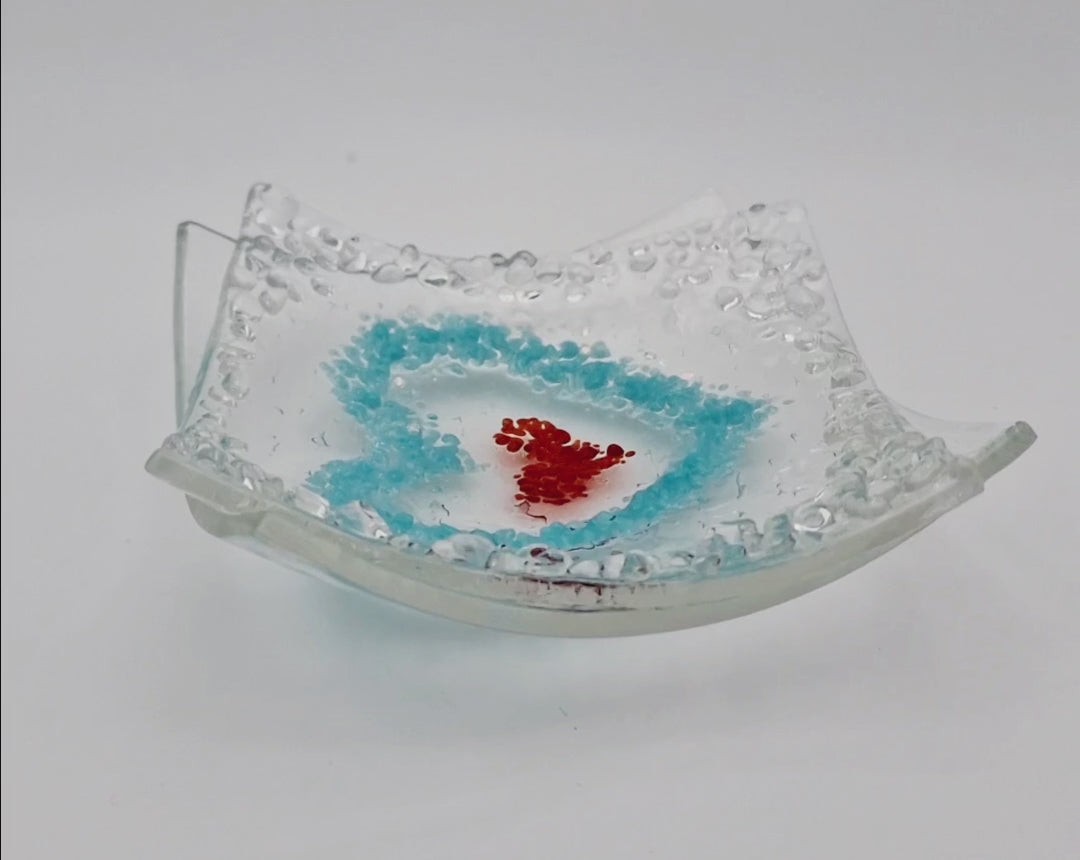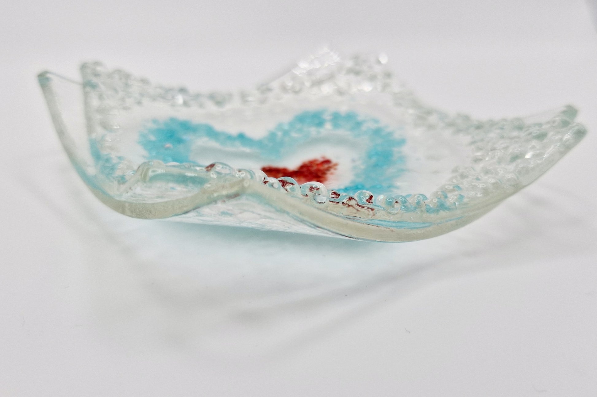 Gorgeous little handmade trinket dish with heart detail in blue and red.