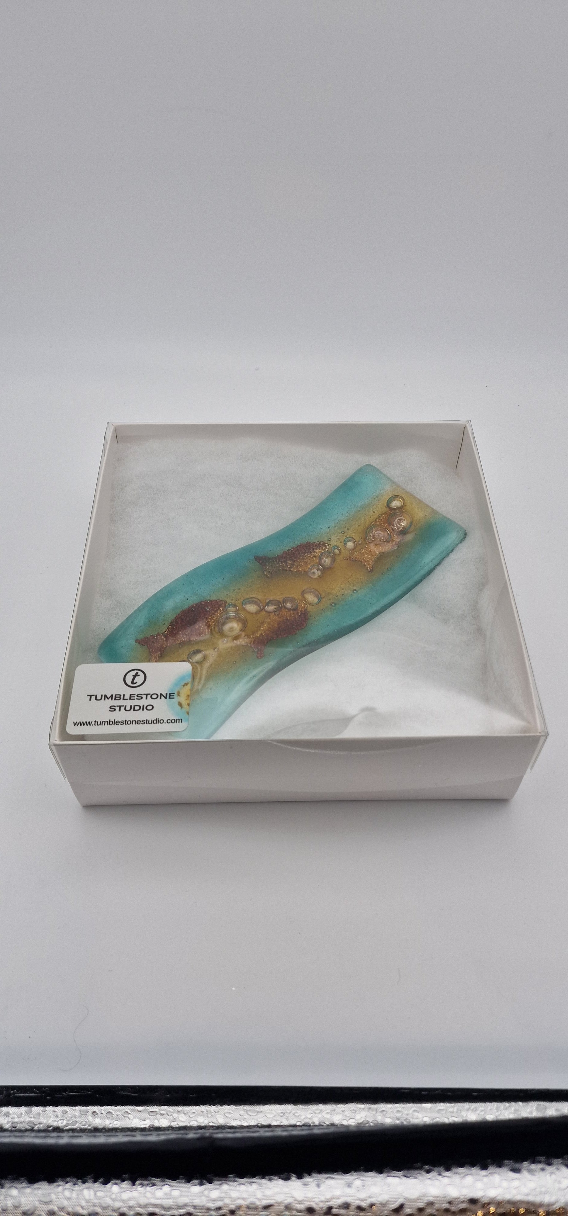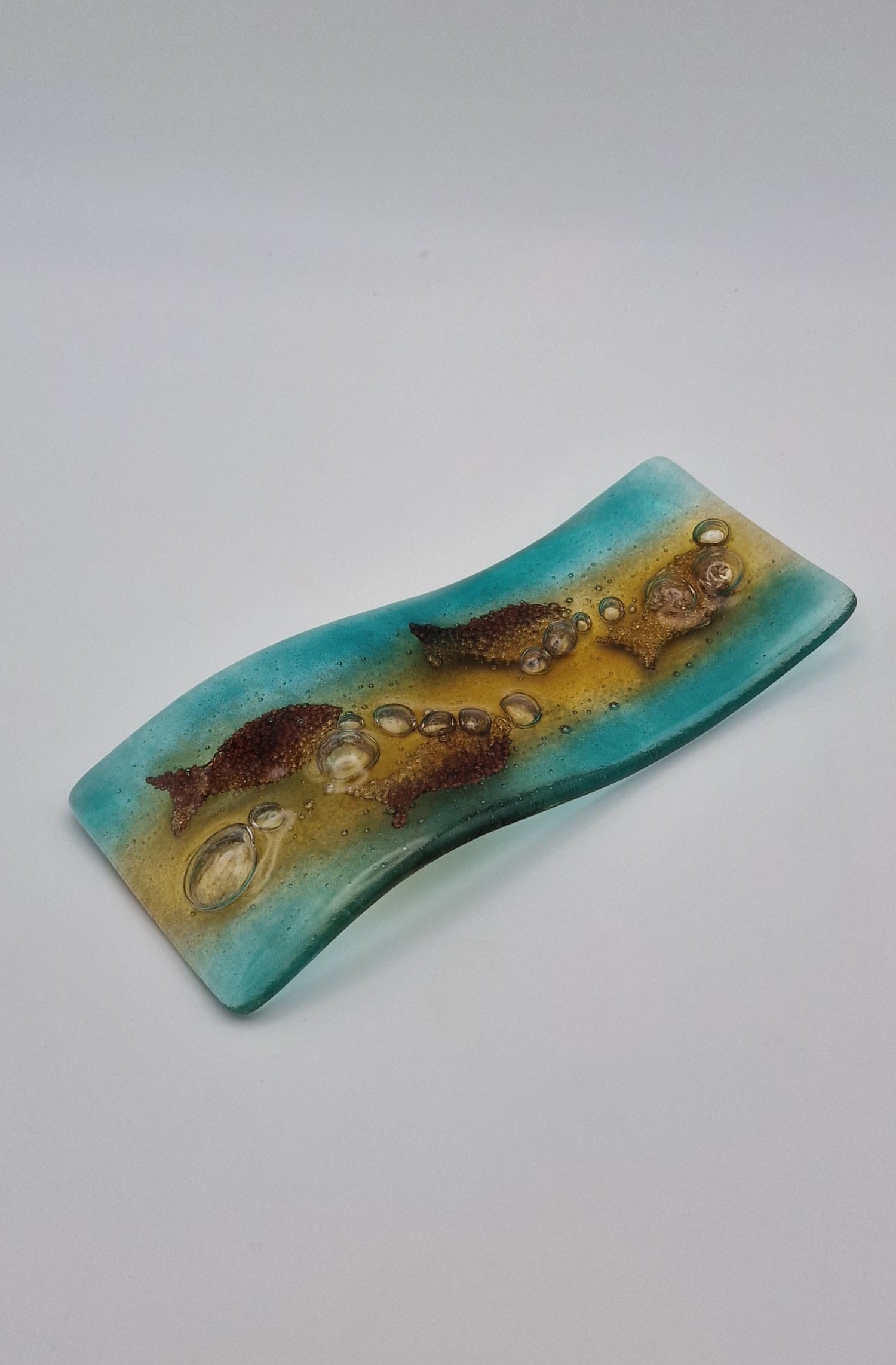 Spoon rest in sea blues and amber tones with metallic fish inclusions