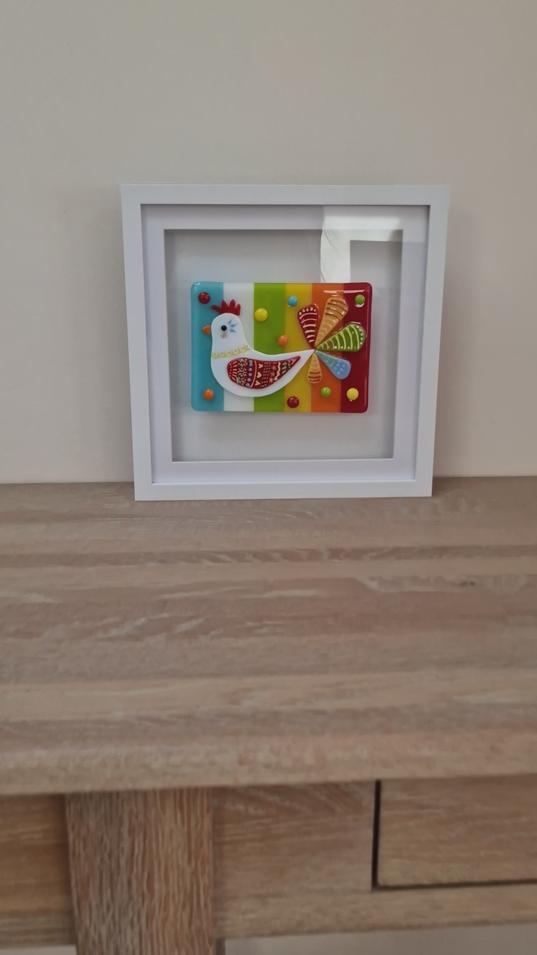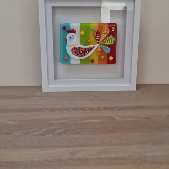Joyful coloured fused glass chicken picture in box frame