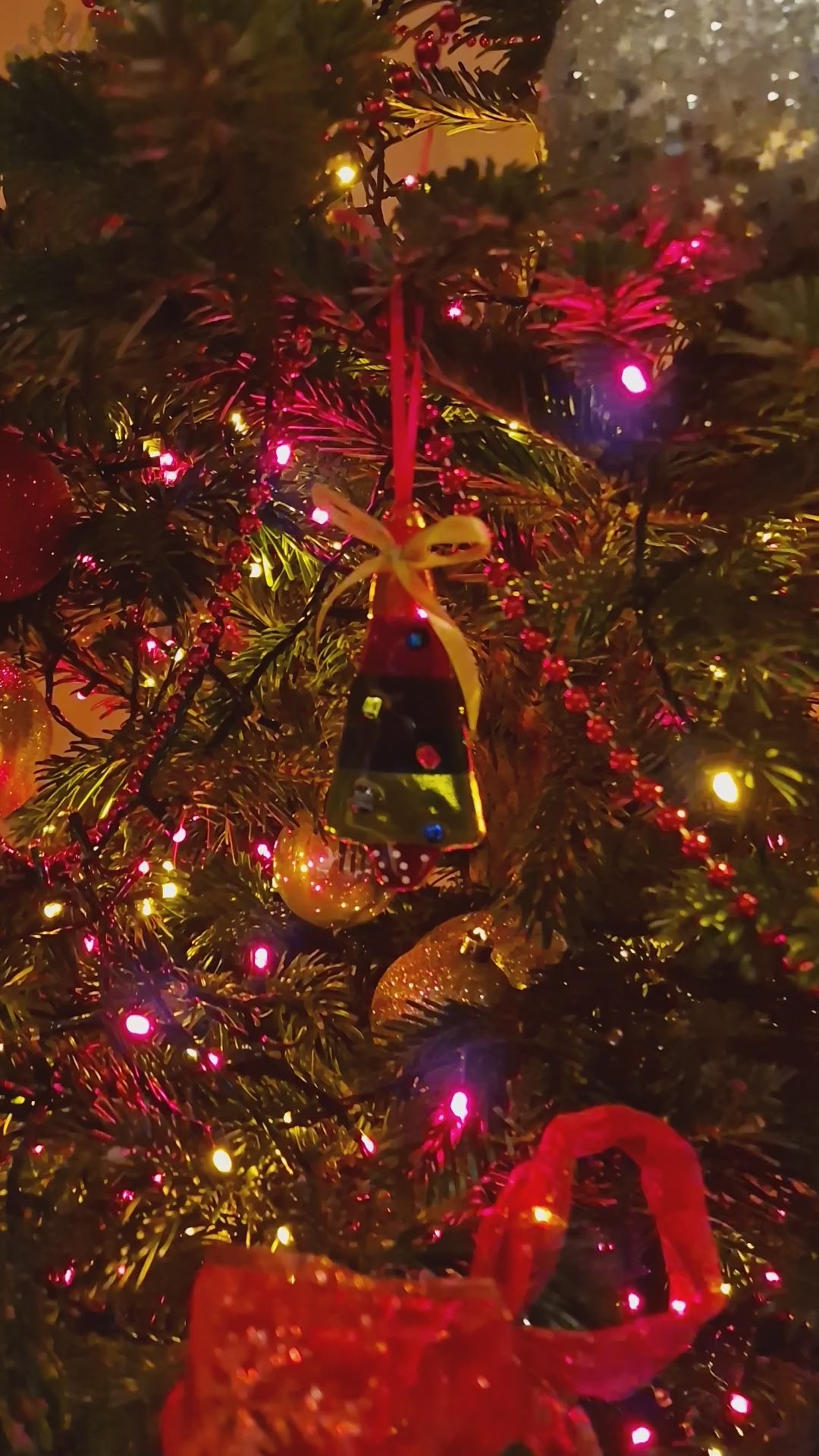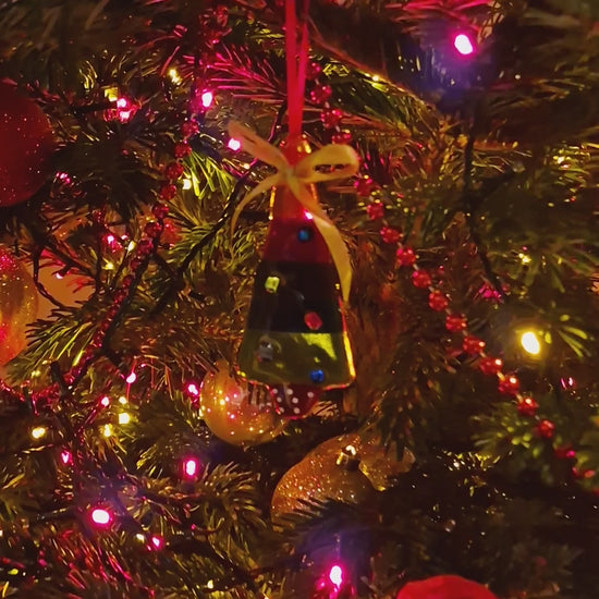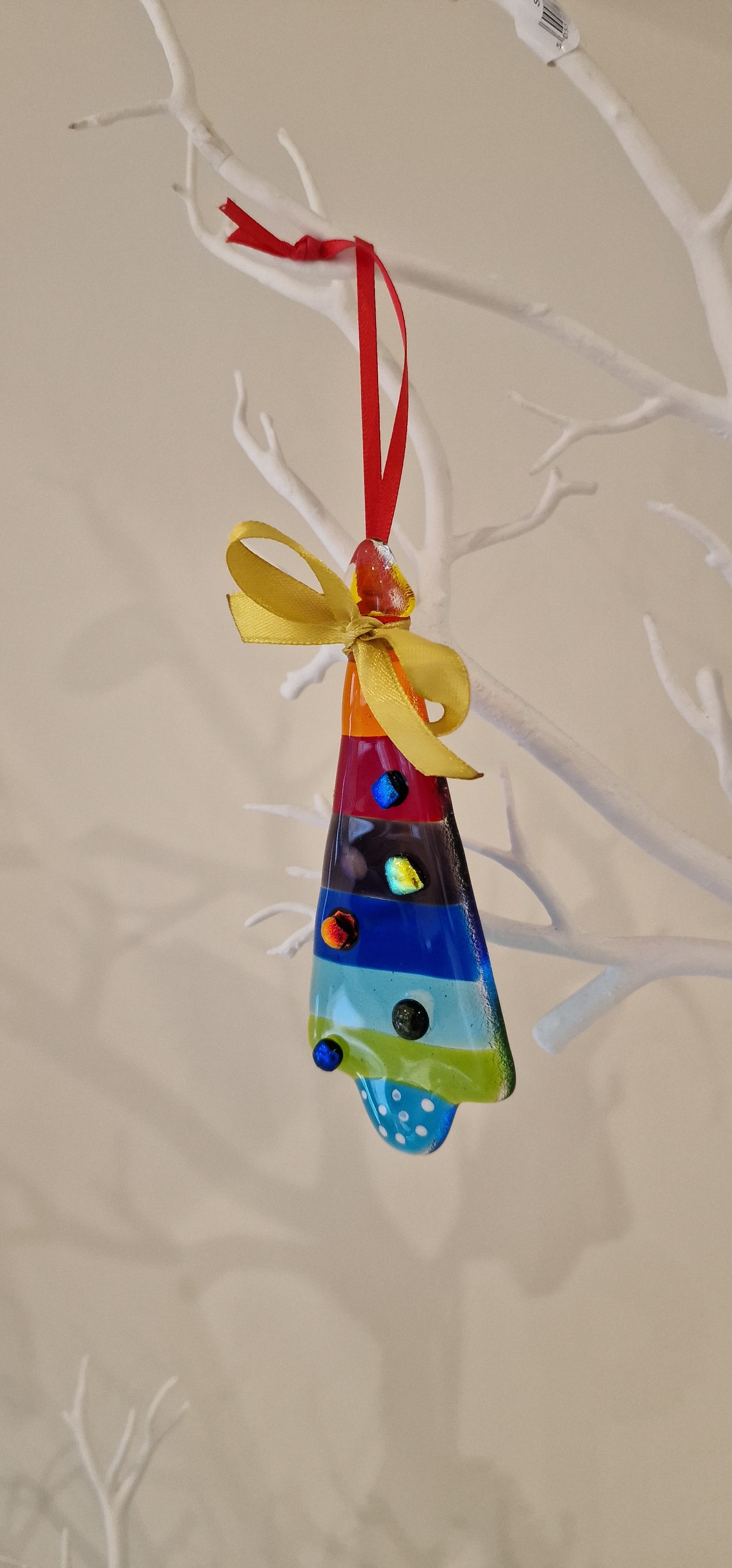 Bright multicoloured cheerful Christmas tree decoration with dichroic embelishment